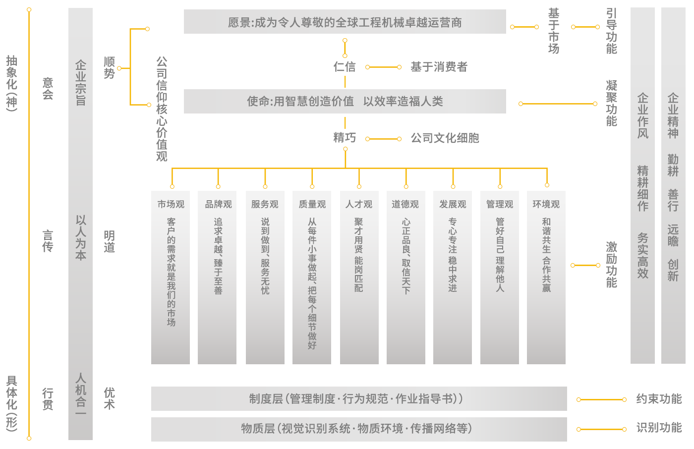 龍工文化包括精神、制度、物質三大層面。